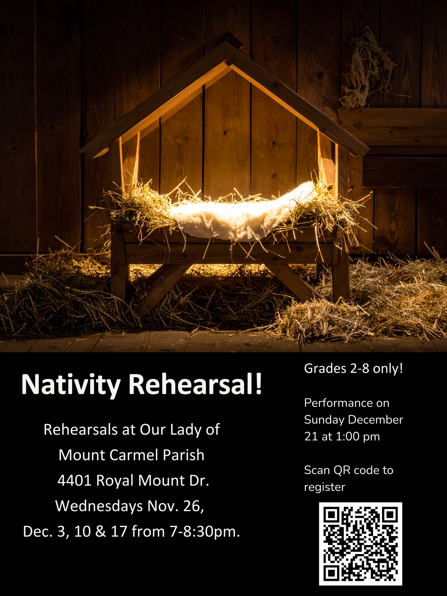 South Windsor Catholic Family of Parishes will be presenting their annual Nativity Play at Our Lady of Mount Carmel Church! This production will take place on Friday December 12th at 6:30 pm, and all families and visitors are welcome to watch the performance!